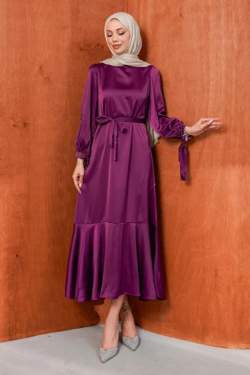 Mor Taş Detaylı Eteği Volanlı Saten Abiye