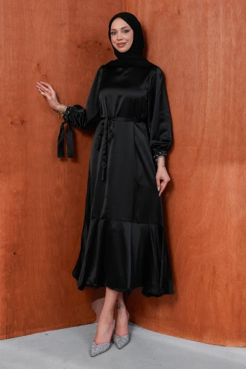 Siyah Taş Detaylı Eteği Volanlı Saten Abiye