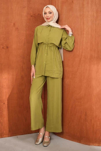 Yağ Yeşili Bel Bağlamalı Tunik Pantolonlu Takım