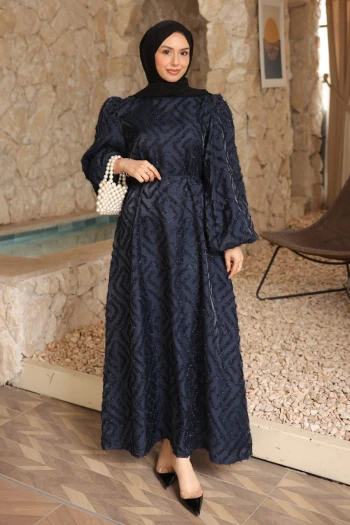 Lacivert Balon Kol Kuşaklı Elbise