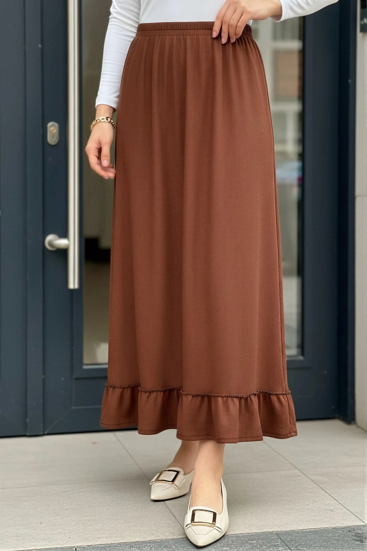Kahverengi Eteği Katlı Bel Lastikli Bürümcük Etek