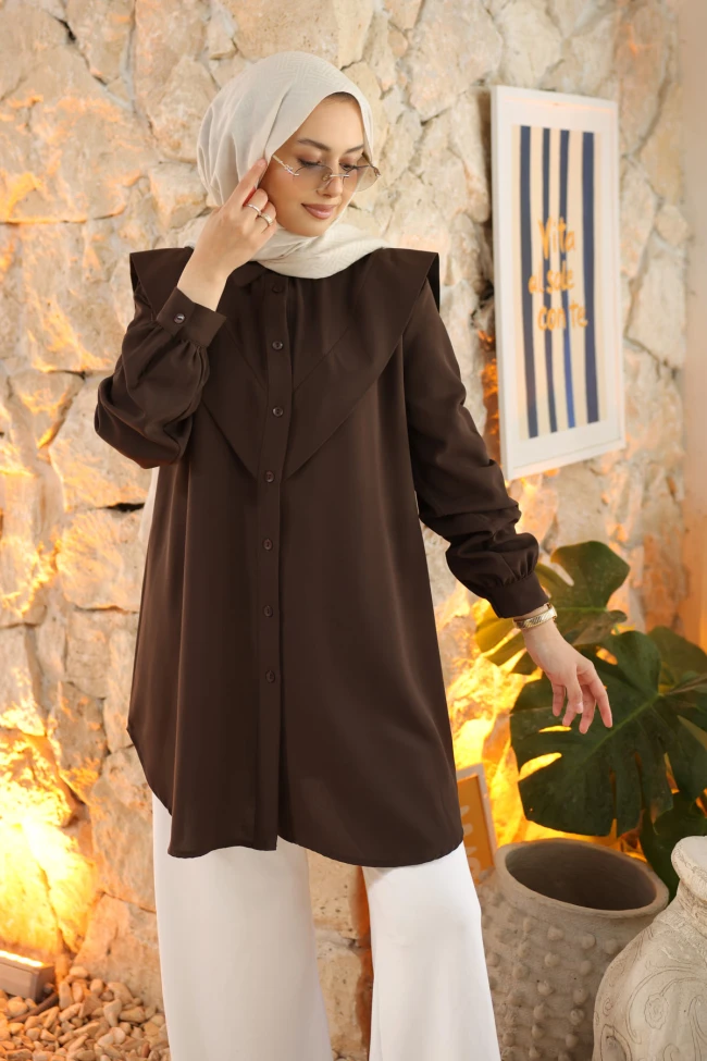 * Ürün Detay : Tunik, hem günlük kullanımda hem de özel davetlerde tarzınızı ön plana çıkarmak için tasarlandı. Modern kesimi ve zarif detaylarıyla gardırobunuzun vazgeçilmez bir parçası olmaya aday.Omuzlardan göğüs hizasına inen V formundaki volan detayı, ürüne hareketli ve modern bir hava katar.Klasik gömlek yakalı ve boydan boya düğmelidir.Rahat hareket imkanı sağlayan, manşetli ve hafif balon kol kesimi.Rahat kesim yapısı sayesinde her vücut tipine uyum sağlar ve tesettür giyim için ideal uzunluktadır.