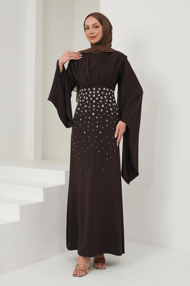 * Ürün Detay :Zarafeti ve modest çizgi çok başarılı bir şekilde harmanlamıştır. Elbisenin en dikkat çekici kısmını oluşturan geniş ve dökümlü kollar, tasarıma hem dramatik bir hava katıyor hem de hareket özgürlüğü sağlıyor. Bu kesim, omuz hattını daha zarif gösterirken elbiseye modern bir silüet kazandırmış.Bel bölgesindeki yoğun taş ve boncuk işlemeleri, dikkati vücudun en ince noktasına çekerek proporsiyonu dengeliyor.