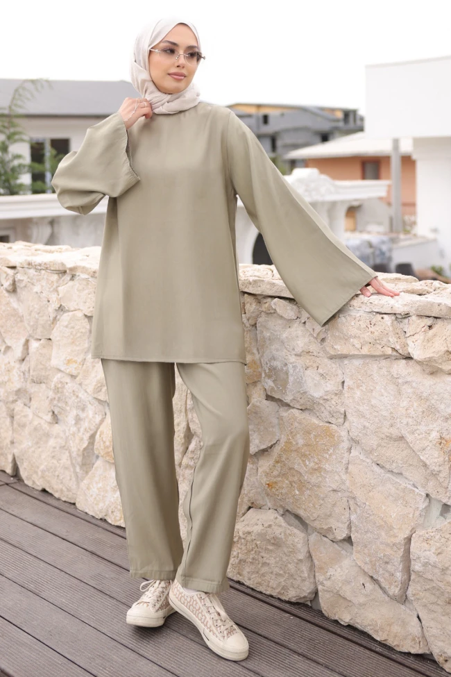 * Ürün Detay : Takım, minimalist tasarımı ve konforu ön plana çıkaran dökümlü yapısıyla tam bir "çabasız şıklık" örneği.Takımın en karakteristik özelliği olan İspanyol kol detayı, minimalist tasarıma zarif bir hareketlilik katmış.Tunik ile mükemmel uyum sağlayan, ne çok dar ne çok geniş olan boru paça kesim. Bu kesim, hem sneakerlarla sportif hem de topuklularla şık bir görünüm elde etmeyi sağlar.Pantolon bel lastiklidir.Yüksek beldir.Ceplidir.