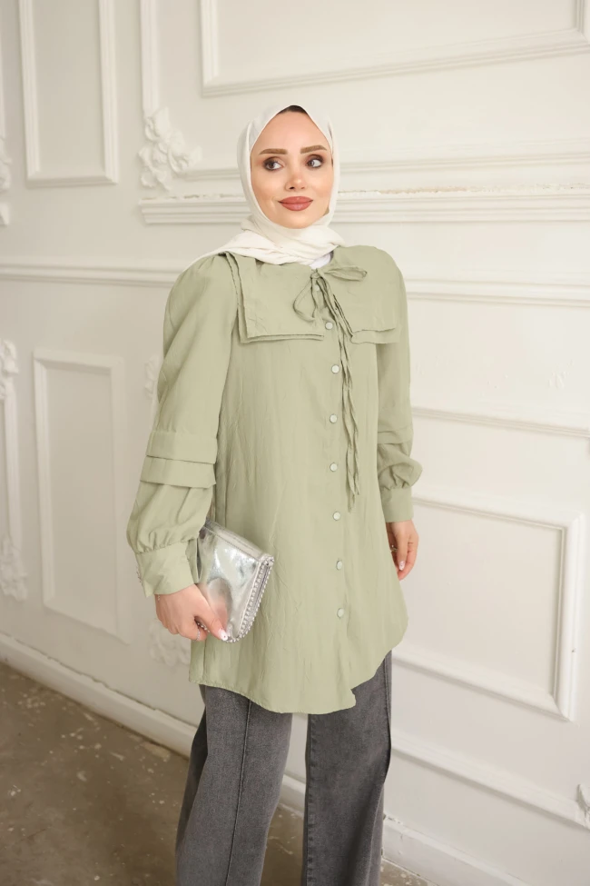 * Ürün Detay : Zarif detayların modern kesimlerle buluştuğu bu tunik gömlek, gardırobunuzun en joker parçalarından biri olmaya aday.Gömlek, özellikle modest tarzını benimseyenler için hem şık hem de karakterli bir parça.Geniş, kare formlu bebe yaka detayı, omuz hattına hareket katarak romantik ve vintage bir hava katıyor.Dirsek hizasındaki yatay piliseler ve büzgülü manşetler, kolların formuna derinlik katar.Gömlek, "çaba sarf etmeden şık görünmek" isteyenler için ideal bir tercih.