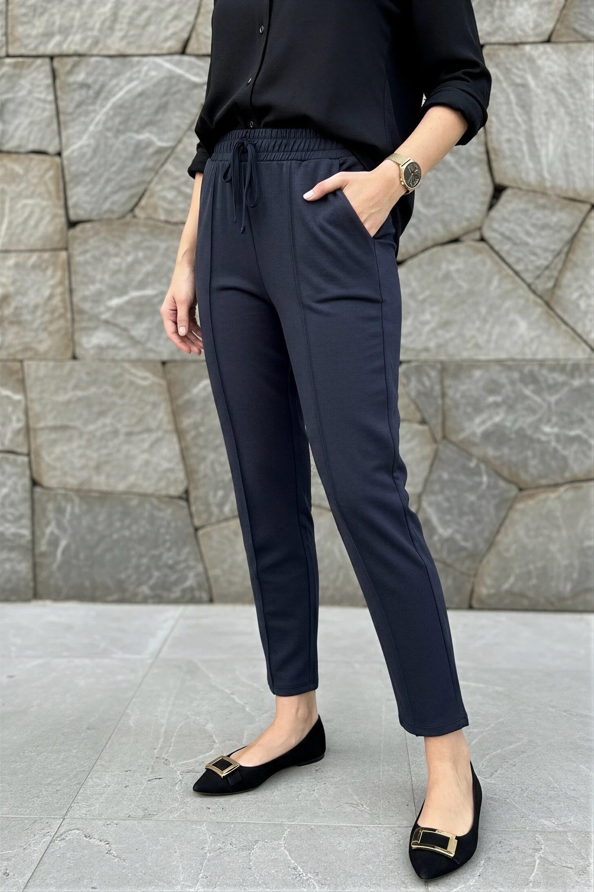 Lacivert Bel Lastikli Çimalı Modal Pantolon Siyah Bel Lastikli Çimalı Modal Pantolon Kahverengi Bel Lastikli Çimalı Modal Pantolon