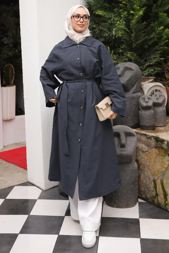 * Ürün Detay : Hem rengi hem de dokusuyla yeni nesil tesettür modasına çok uygun ve oldukça kullanışlı bir parça.Kumaşın krinkıl dokusu, ürüne spor-şık bir hava katmış.Reglan kol kesimi ve beldeki kuşak, ürüne modern bir siluet kazandırıyor. Dik yakadaki düğme detayı, rüzgarlı havalar için fonksiyonel olduğu kadar estetik bir duruş da sergiliyor.Ürünümüz bel kuşaklıdır ve ceplidir.