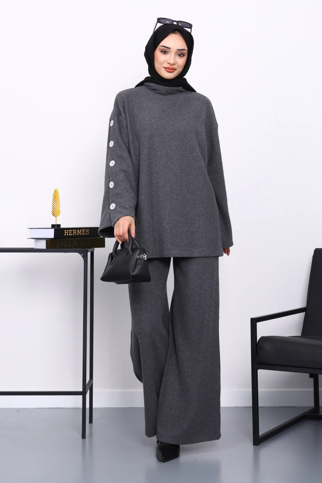 Lacivert Kol Düğme Detaylı Tunik Pantolonlu Takım Pembe Kol Düğme Detaylı Tunik Pantolonlu Takım Kahverengi Kol Düğme Detaylı Tunik Pantolonlu Takım