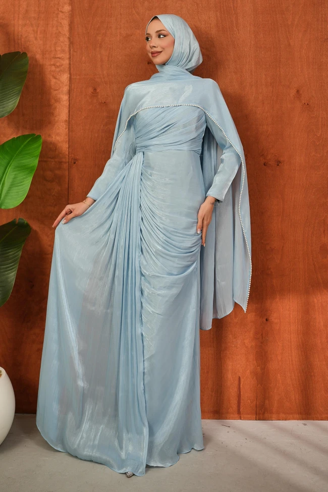 * Ürün Detay : Özel günleriniz için kurtarıcı parça! Kendinden pelerinli tasarımı sayesinde aksesuar zahmetine girmeden tam bir şıklık sunan abiyemiz, dikey pileli etek yapısıyla daha uzun ve ince bir görünüm vadediyor.Modern tesettür şıklığını inci zarafetiyle birleştirin.Bel bölgesindeki çapraz drape detayları, karın bölgesini kusursuz bir şekilde kamufle ederken, eteğin dikey pilleleri boyu olduğundan daha uzun gösteriyor.Omuzlardan dökülen tül pelerin, tasarıma dramatik bir hava katarken, kenarlarındaki inci işlemeler yüz hattını aydınlatan zarif bir çerçeve oluşturuyor.