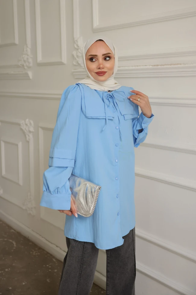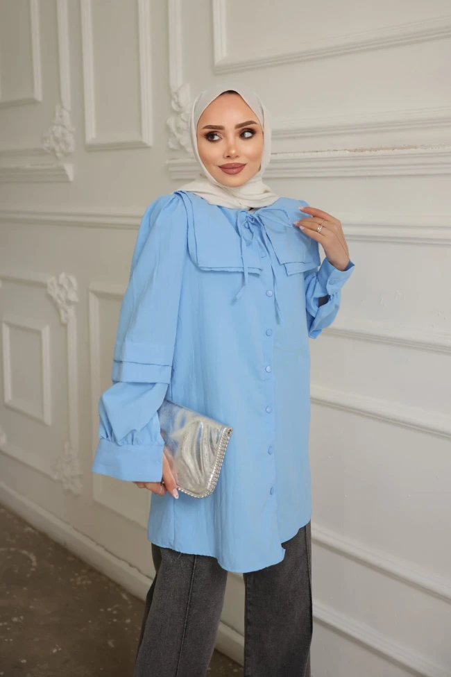 * Ürün Detay : Zarif detayların modern kesimlerle buluştuğu bu tunik gömlek, gardırobunuzun en joker parçalarından biri olmaya aday.Gömlek, özellikle modest tarzını benimseyenler için hem şık hem de karakterli bir parça.Geniş, kare formlu bebe yaka detayı, omuz hattına hareket katarak romantik ve vintage bir hava katıyor.Dirsek hizasındaki yatay piliseler ve büzgülü manşetler, kolların formuna derinlik katar.Gömlek, "çaba sarf etmeden şık görünmek" isteyenler için ideal bir tercih.