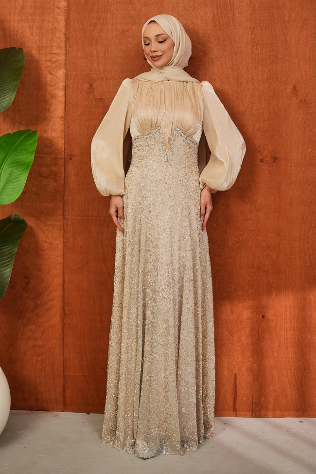 * Ürün Detay :Işıltının en zarif haliyle tanışın! Bel hattındaki kristal detayları ve uçuş uçuş balon kollarıyla bu özel tasarım abiye, en mutlu günlerinizde size eşlik etmek için hazır. Zarafeti detaylarda saklı olanların tercihi…Üst kısımdaki hafif ışıltılı büzgülü doku ile etek kısmındaki yoğun işleme harika bir kontrast oluşturmuş.Bel hattındaki taş detaylı "V" geçişi, vücut formunu daha uzun ve ince gösteren stratejik bir dokunuş.Balon kol detayı, elbiseye hem romantik hem de modern bir hava katarken, tesettür giyimde aranan o zarif hacmi sağlıyor.