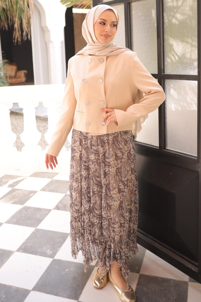 * Ürün Detay : Kruvaze kesimli siyah ceket, üzerindeki gold detaylı büyük düğmelerle zengin bir görünüme sahip. Hakim yaka ve kısa kesimi, alt parçanın hareketliliğini dengeleyerek modern bir silüet oluşturuyor.Şal desenli pileli etek, kombine hem klasik hem de dinamik bir hava katmış. Eteğin dökümlü yapısı, tesettür standartlarına uygun bir konfor sunuyor.