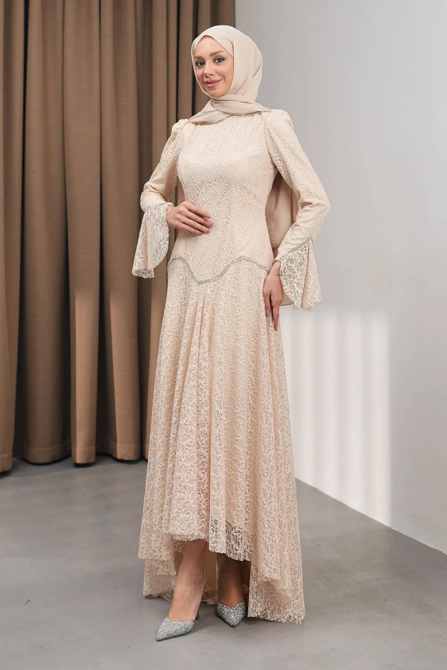 * Ürün Detay : Abiye, ilk bakışta oldukça gizemli ve sofistike bir duruş sergiliyor.Elbisenin en dikkat çekici özelliği önü kısa, arkası uzun kesimi. Bu tasarım, elbiseye modern bir hava katarken ayakkabılarınızın da ön planda olmasını sağlıyor.Dirsek hizasından başlayan geniş güpür volanlar, elbiseye hareket ve romantik bir hava katmış. Kol ağzındaki ince taş şeritler ise bu hareketi zarifçe çerçeveliyor.Taş detayları sadece bel ve kol uçlarında kullanıldığı için abartıdan uzak, "tadında" bir ışıltı yakalanmış.