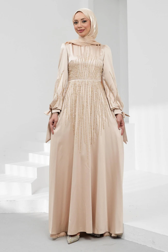 * Ürün Detay : Saten abiye, hem kumaş kalitesi hem de üzerindeki işleme detaylarıyla oldukça iddialı ve zarif bir parça.Göğsünden aşağıya ve kollara doğru yayılan dikey taş işlemeler, elbiseye hareket katmış. Dikey formda inmeleri, giyen kişiyi olduğundan daha uzun ve ince gösterme avantajı sağlar.Balon kol detayları ve bileklerdeki fiyonk bağlamalar, elbiseye romantik ve feminen bir hava katmış. Bu tarz detaylar düz kesim elbiseleri sıradanlıktan kurtarır.Belden oturan ve aşağıya doğru hafif genişleyen formu, her vücut tipine uyum sağlayabilecek garantili bir kesimdir.