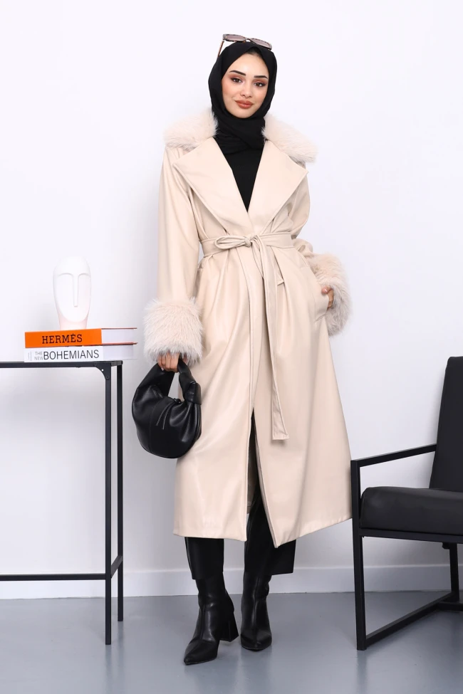 * Ürün Detay : Ürünümüz Suni Deri  Kumaştan Üretilmiştir. Yaka ve kol kısımları kürk detaylıdır. Bel kısmı kuşaklı ve ceplidir.