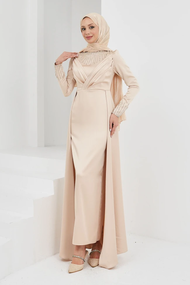 * Ürün Detay :Sezona damgasını vuracak olan abiye modelimiz , zarafeti ve modern detayları bir araya getiren oldukça şık bir tasarım.Yakadaki taş işlemeleri kolyeye ihtiyaç bırakmayacak bir ışıltı katmış. Göğüs kısmındaki çapraz drapeler, elbiseye derinlik kazandırarak daha hareketli ve lüks bir görünüm sağlıyor.Manşetlerdeki taş işlemeleri, yakadaki detayla harika bir bütünlük içinde. Bu tarz detaylar "premium" bir hissiyat yaratır.Etek kısmının yanlarından aşağı uzanan parça detayları, elbiseye bir pelerin havası katmış. Bu, yürürken akışkan ve görkemli bir duruş sergileyecektir.Özel günlerde asaletini ön plana çıkarmak isteyenler için çok başarılı bir tercih.