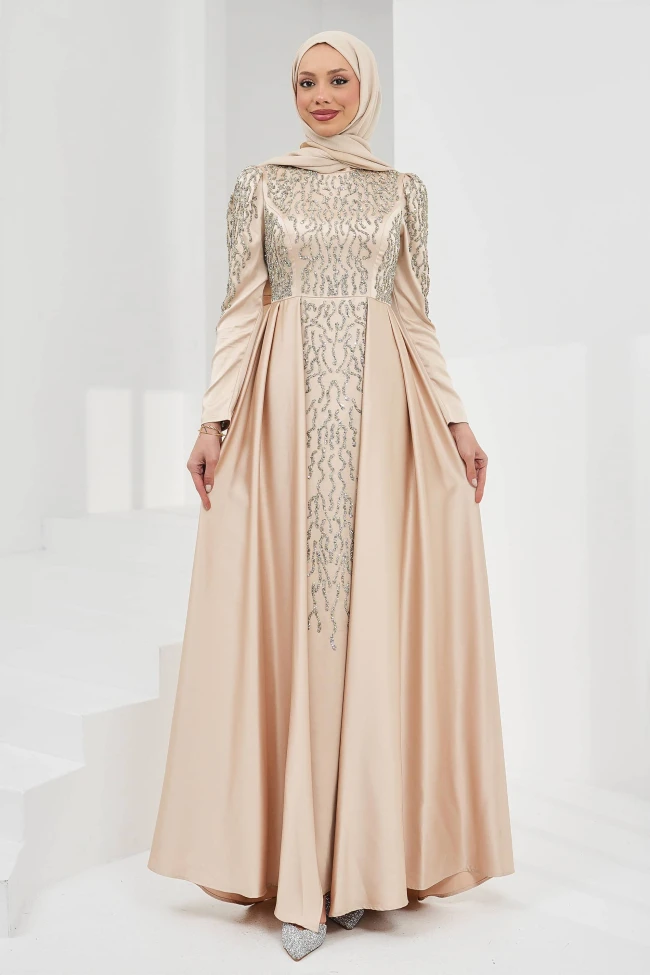 * Ürün Detay : Özel davetlerin ve düğünlerin yıldızı olmaya hazır mısınız? Yüksek kaliteli saten kumaşın asaletini, gümüş işlemelerle birleştirdik. Modern A-kesim formu sayesinde hem zarif bir silüet sunar hem de gün boyu hareket özgürlüğü sağlar.Abiyemiz, özellikle modest segmentinde oldukça şık bir parça.Modern çizgilerle geleneksel zarafeti birleştiren bir "A-kesim saten abiye".Göğüs panelinde ve omuzlarda yoğun, dikey formlu gümüş işlemeler mevcut. Bu dikey işlemeler boyu daha uzun gösterme avantajı sağlar.