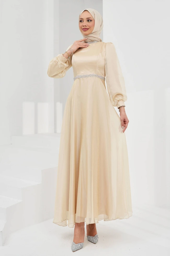 * Ürün Detay : Yeni sezon abiyemiz romantik ve akışkan bir yapıya sahip. Janjan kumaşın oluşturduğu saydamlık ve derinlik hissi, elbiseyi oldukça zarif kılıyor.Yakada ve bel hattında kullanılan taşlı kemer detayları, elbiseye hareket katmış. Bu işlemeler, ekstra bir kolye kullanımına gerek bırakmadan yüzü ve beli ön plana çıkarıyor.Balon kol detayı ve bileklerdeki zarif büzgüler, elbiseye modern bir hava katmış. Etek kısmındaki katmanlı yapı ise yürürken uçuş uçuş, masalsı bir görünüm vaat ediyor.