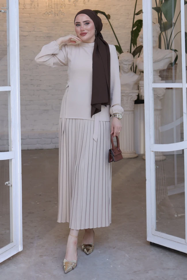 * Ürün Detay : Yeni sezona uygun ithal krep kumaştan üretilmiştir. Bluz yan detaylıdır. Etek piliselidir.