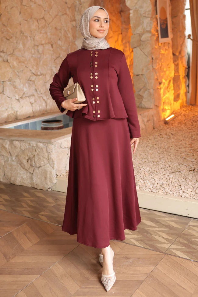 * Ürün Detay : Düğmeler, takıma lüks ve resmi bir hava katıyor. Bu tür metalik detaylar, ürünü "premium" kategorisine yükseltmektedir.Ceketin belden aşağıya doğru genişleyen formu, bel hattını vurgulayarak zarif bir silüet oluşturuyor. Aynı zamanda basen bölgesini kamufle ettiği için müşterilerimiz tarafından oldukça talep gören bir kesimdir.Takımı tamamlayan geniş kesim etek, hareket özgürlüğü sağlarken klasik duruşu destekliyor.