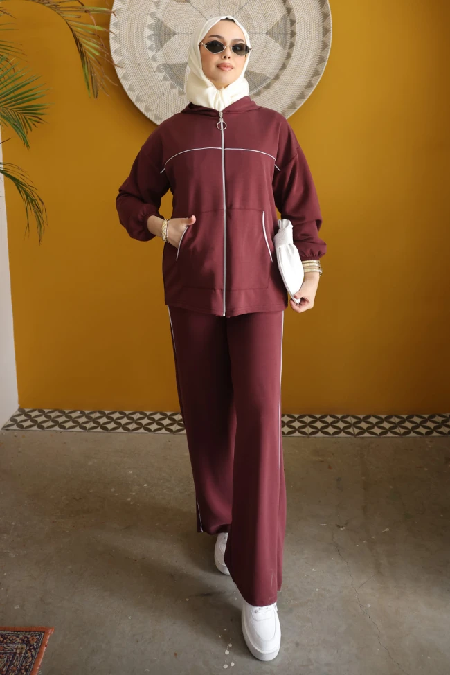 * Ürün Detay : Bu takım, "çabasız şıklık" tanımının tam karşılığı.Hem konforu hem de modern stili bir araya getiren oldukça dengeli bir parça.Zemin üzerine eklenen ince beyaz şeritler, takıma sportif bir hava katarken aynı zamanda vücut hattını dikeyde bölerek daha ince ve uzun bir silüet illüzyonu yaratıyor.Sweat hafif "oversize" ve düşük omuzlu kesimi, gün boyu hareket özgürlüğü vaat ediyor. Pantolonun bol paça gelişi ise hem tesettür giyim standartlarına uygun hem de oldukça trend bir görünüm sunuyor.Fermuar detayı ve cepler, takımı sadece şık değil, aynı zamanda pratik bir "günlük kurtarıcı" haline getirmiş.