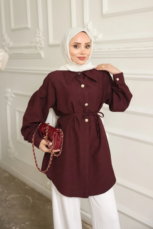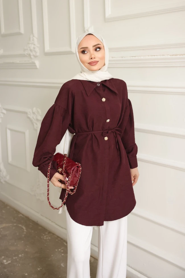* Ürün Detay :Gömlek, özellikle modaest çizgisine hitap eden, hem şık hem de oldukça işlevsel bir parça.Düşük omuzlu ve genişleyen kol kesimi, hem rahat hareket imkanı sağlıyor hem de modern bir silüet oluşturuyor. Manşet kısımlarının büzgülü olması bu hacmi güzel dengeliyor.Gömleğin kendi kumaşından olan ince bağlama detayı, oversize kesimin vücudu boğmasını engelleyerek beli ortaya çıkarıyor. Bu da boyu olduğundan daha uzun ve formu daha düzenli gösterir.Gold ve taşlı detaylara sahip düğmeler, kombine takı takmışçasına bir ışıltı katmış.