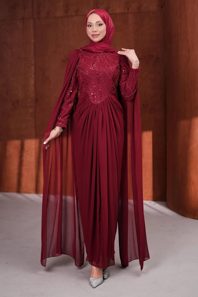 * Ürün Detay : Özel günlerin en şık ismi olurken, drape kesimin sağladığı hareket özgürlüğüyle gecenin tadını doyasıya çıkarın.Göğüs kısmındaki işlemeleri, kıyafete lüks bir hava katarken tüm dikkati yüze ve üst bedene çekiyor. İşlemelerin V formunda aşağı doğru inmesi, beli olduğundan daha ince gösteren illüzyonist bir dokunuş.Omuzlardan aşağı süzülen şifon pelerin detayları, hareket ettikçe büyüleyici bir akışkanlık sağlıyor. Bu detay hem kollarını kapatmak isteyenler için şık bir çözüm sunuyor.Karın bölgesinden başlayan dikey pileler ve "drape" kesim, vücut hatlarını yumuşatırken boyu daha uzun gösteriyor.