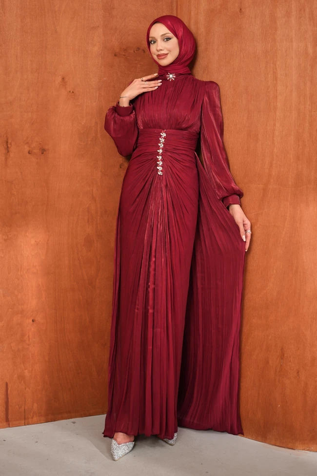 * Ürün Detay : Abiye, hem tasarımı hem de kumaş dokusuyla zarafeti ve modernizmi bir araya getiren şık bir parçadır.Bel bölgesindeki yoğun drapeler ve aşağı doğru süzülen pileli yapı, silüeti daha ince ve uzun gösteren formdadır.Yakadaki zarif broş ve bel hattı boyunca dikey olarak yerleştirilen taş süslemeler, tasarıma lüks bir ışıltı kazandırır.Balon kol detayı, manşetlerle birleşerek hem konforlu bir kullanım sunar hem de elbiseye nostaljik bir şıklık katar.