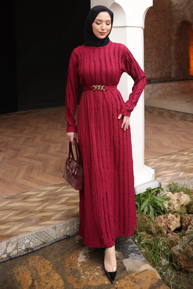 * Ürün Detay : Elbisenin üzerindeki dikey şeritli kabartma doku, düz siyah bir elbiseye derinlik ve zenginlik katıyor.Zincir detaylı kemer, zemin üzerinde şık bir kontrast oluşturarak bel bölgesini ön plana çıkarıyor ve vücut hatlarını zarifçe dengeliyor.