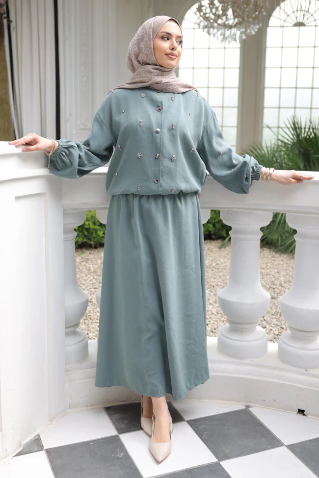 * Ürün Detay : Şık tasarımı ve taş detaylarıyla yeni sezon takım modelimiz sizlerle.Etek ve üst parçanın rahat kesimi, şıklığı konforla birleştirmiş.Üst parçadaki taş işlemeler, düz bir takımı anında "özel gün" veya "şık davet" kategorisine taşımış. İşlemelerin çiçek formunda ve simetrik dağıtılması, tasarıma hareket katarken zarafeti korumuş.Kollardaki büzgülü manşet detayları modern bir dokunuş sağlarken, beldeki lastik kısmı takımın formunu koruyarak daha derli toplu durmasını sağlamış.