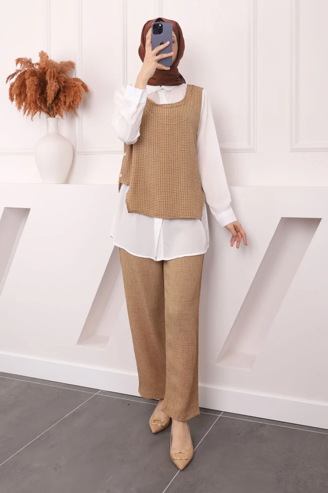 * Ürün Detay : Ürünümüz Yeni Sezona Uygun Krep Kumaştan üretilmiştir. Süveter-Gömlek-Pantolon Üçlü Takım şeklindedir. Süveter kolye detaylıdır. Yan düğmelidir.