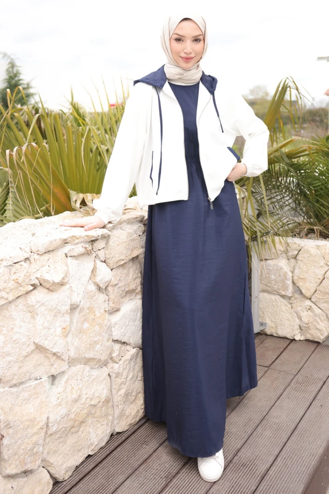 * Ürün Detay : Kombin takım, spor şıklığı muhafazakar bir tarzla çok başarılı bir şekilde harmanlamış. Elbisenin ve ceketin uyumu, günlük kullanım için hem konforlu hem de estetik bir görünüm sunuyor.Elbisenin bel kısmındaki hafif büzgü, vücut hatlarını belli etmeden zarif bir silüet sağlıyor.Kapüşonlu ceket, kombine dinamik ve genç bir hava katmış. Ceketin boyu, uzun elbiseyle orantılı bir kesime sahip; bu da boyu daha uzun gösteren bir illüzyon oluşturuyor.Elbise sıfır koldur.