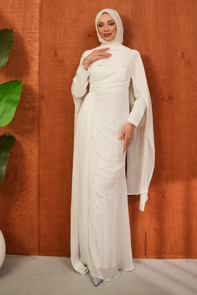* Ürün Detay : Özel günleriniz için kurtarıcı parça! Kendinden pelerinli tasarımı sayesinde aksesuar zahmetine girmeden tam bir şıklık sunan abiyemiz, dikey pileli etek yapısıyla daha uzun ve ince bir görünüm vadediyor.Modern tesettür şıklığını inci zarafetiyle birleştirin.Bel bölgesindeki çapraz drape detayları, karın bölgesini kusursuz bir şekilde kamufle ederken, eteğin dikey pilleleri boyu olduğundan daha uzun gösteriyor.Omuzlardan dökülen tül pelerin, tasarıma dramatik bir hava katarken, kenarlarındaki inci işlemeler yüz hattını aydınlatan zarif bir çerçeve oluşturuyor.