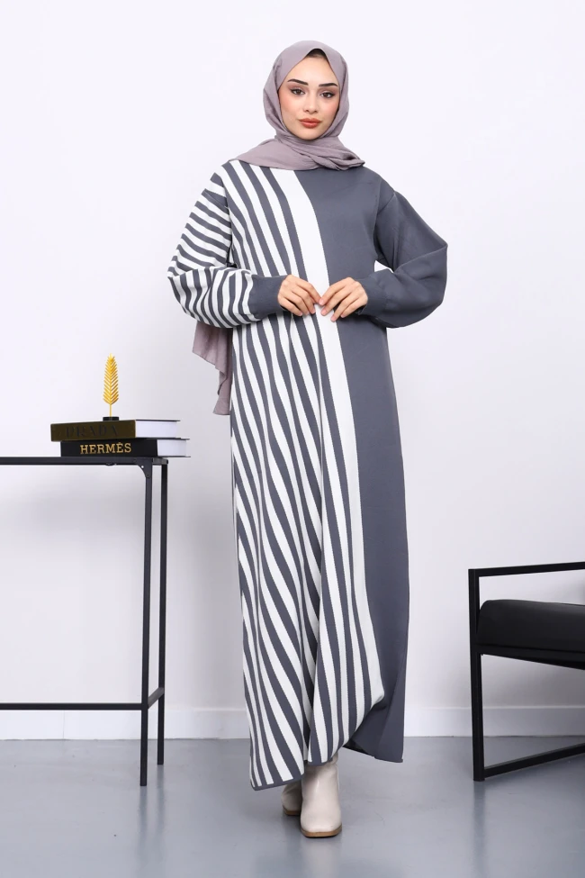 Ekru Çizgili Triko Elbise Saks Mavi Çizgili Triko Elbise Bordo Çizgili Triko Elbise Kahverengi Çizgili Triko Elbise