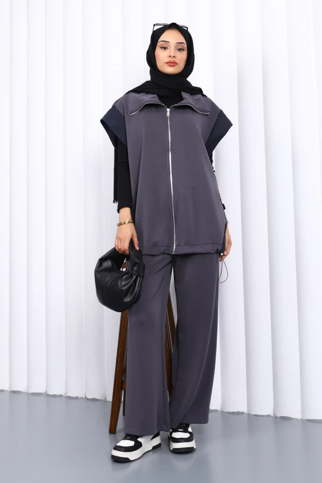 * Ürün Detay : Ürünümüz Pamuklu Modal Kumaştan Üretilmiştir. Yelek ve Pantolon ikili takım şeklindedir. Yelek ön kısmı düğmeli ve etek uç kısmı kulisan kemer detaylıdır.