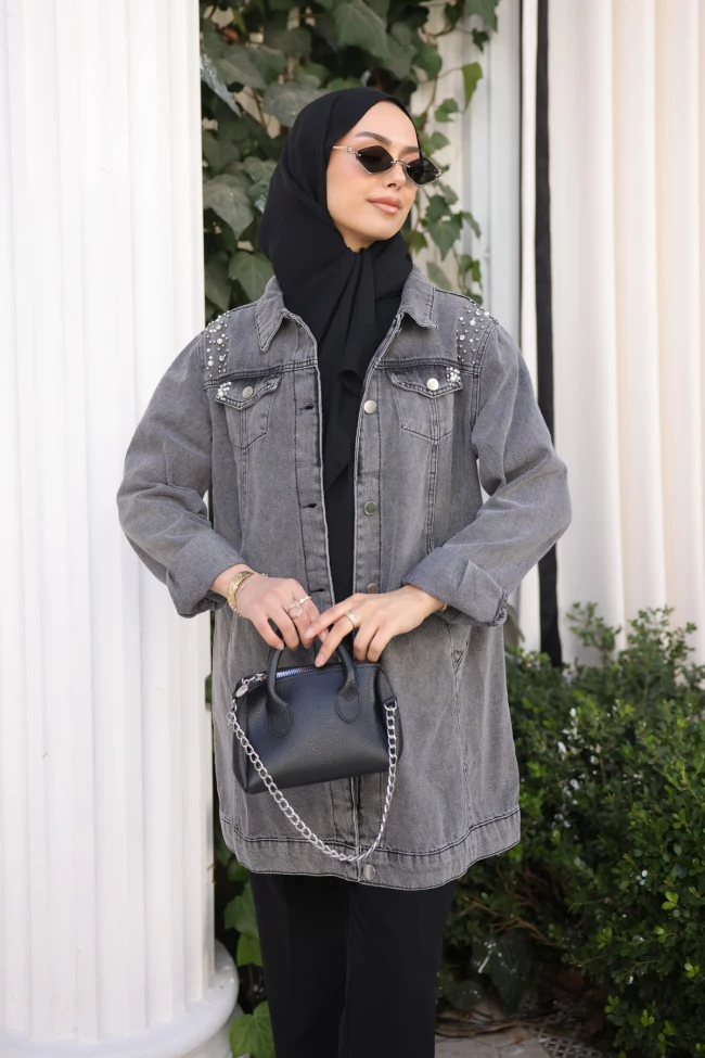 Lacivert İnci İşlemeli Kot Ceket Siyah İnci İşlemeli Kot Ceket Mavi İnci İşlemeli Kot Ceket