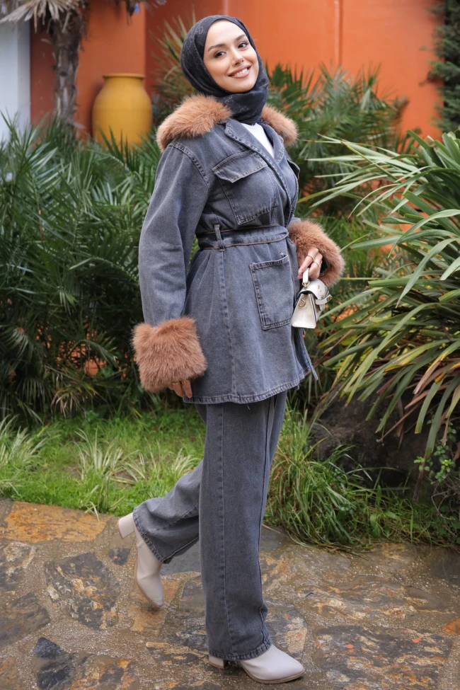 Mavi Kol Yaka Kürklü Kot Ceket Pantolonlu Takım Koyu Mavi Kol Yaka Kürklü Kot Ceket Pantolonlu Takım