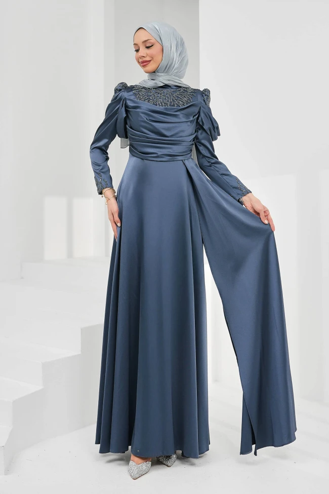 İndigo Önü Drapeli Taşlı Saten Abiye Lacivert Önü Drapeli Taşlı Saten Abiye Bej Önü Drapeli Taşlı Saten Abiye