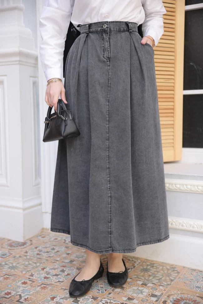* Ürün Detay : Etek, klasik jean dokusunu feminen bir silüetle birleştiren, özellikle tesettür giyimde "A-kesim" formunun en konforlu örneklerinden biri.Eteğin en güçlü yönü beldeki pile detayları.Etek ucundaki koyu renkli şerit (yıkama izi), tasarıma modern bir dokunuş katmış ve eteğin dökümünü ağırlaştırarak daha kaliteli durmasını sağlamış.
