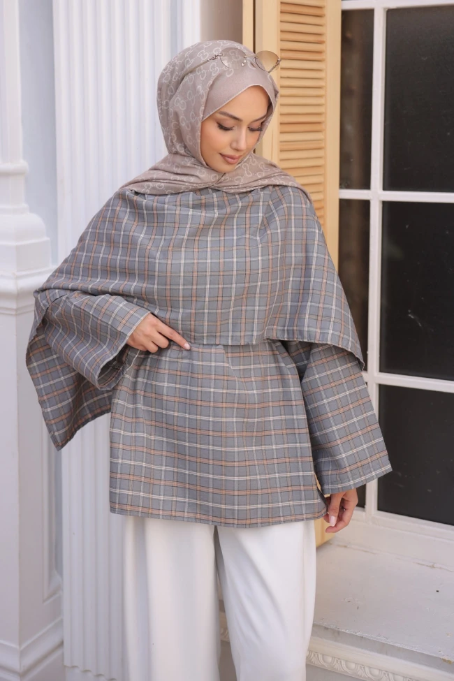 * Ürün Detay : Hem geleneksel hem de modern dokunuşları bir araya getiren oldukça özgün bir tasarıma sahip. Özellikle "pelerin detaylı" yapısıyla standart tunik modellerinden ayrılıyor.Omuzlardan aşağı dökülen geniş kumaş katmanı, tasarıma dramatik ve zarif bir hava katmış. Bu detay, hem hareket özgürlüğü sağlıyor hem de vücut hatlarını çok iyi kamufle ediyor.Beldeki ince kuşak, tuniğin oversize kesimini dengeleyerek silüetin kaybolmasını engellemiş. Beli vurgulaması, pelerinin genişliğiyle güzel bir kontrast oluşturuyor.Bu parça hem günlük şıklık hem de ofis ortamı için "çaba harcamadan şık" görünmenin anahtarı olabilir. Özellikle geniş kollar ve pelerin detayı, kıyafete mimari bir duruş kazandırmış.