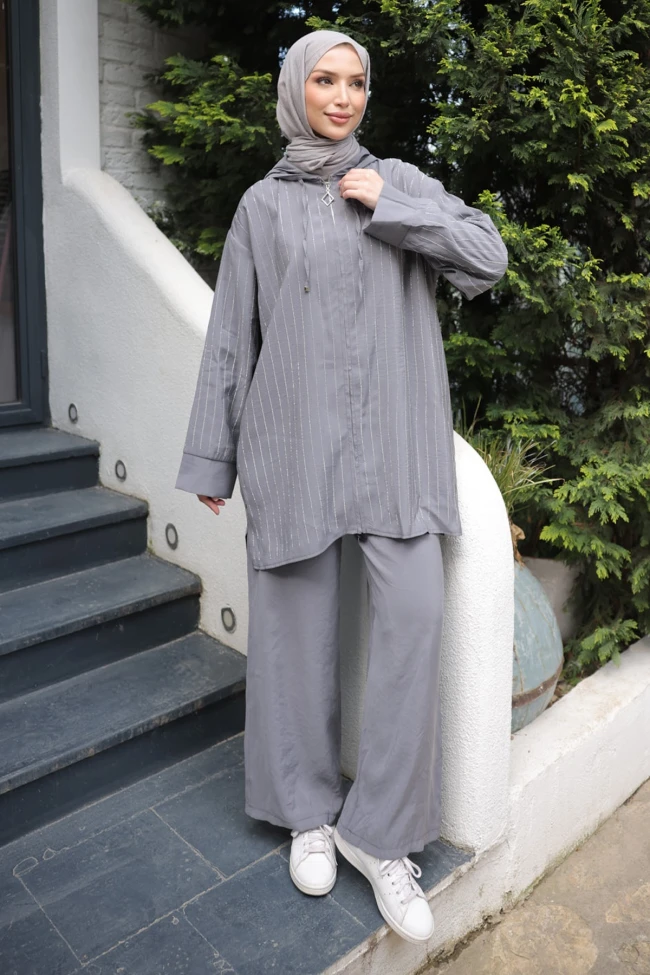 * Ürün Detay : Takım, spor-şık akımını tesettür modasına çok modern ve dinamik bir şekilde taşıyor. Klasik spor takımların konforunu, dikey çizgi detaylarıyla görsel bir şölene dönüştürmüş.Zemin üzerine kullanılan beyaz dikey çizgi şeklindeki taşlar, takıma sadece hareket katmakla kalmıyor, aynı zamanda optik olarak vücut formunu daha uzun ve ince gösteriyor.Üst parça, fermuarlı ve kapüşonlu yapısıyla sportif bir ruh taşıyor. Düşük omuz kesimi ve geniş manşetleri, modern sokak stiline vurgu yaparken, ideal boyu tesettür standartlarını tam karşılıyor. Fermuar ucundaki geometrik detay ise ince bir tasarım dokunuşu olmuş.Düz ve bol paça pantolon, hareketli üst parçayı çok iyi dengeliyor.