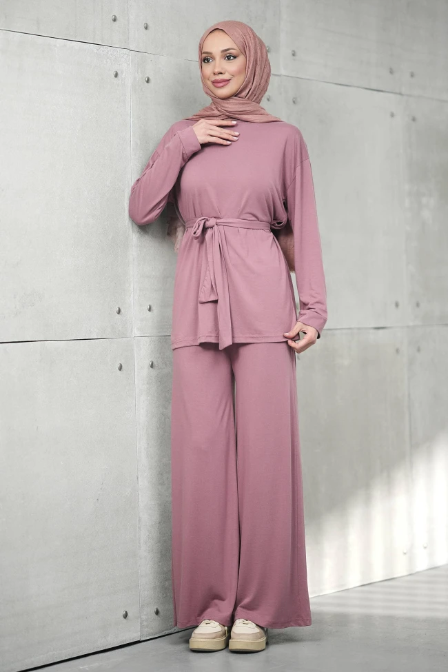 * Ürün Detay : İkili takım, hem konforu hem de zarafeti bir araya getiren modest tarz giyim örneği.Düşük omuzlu ve geniş kesimli olması, gün boyu hareket özgürlüğü sağlar. Beldeki kuşak detayı, silueti belirginleştirerek formun kaybolmasını engellemiş ve takıma daha derli toplu bir görünüm kazandırmış.Bol paça kesimi hem çok moda hem de rahatlık açısından avantajlı.Pantolon bel bağlamalı ve cepli yüksek bel.Tunik bel kısmı köprülü.