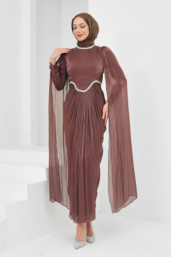 * Ürün Detay : Modern ve zarif detayların birleştiği, özellikle modest moda için oldukça şık bir tasarım.Pelerin ve etek kısmındaki dikey pileli şifon detaylar tasarıma hareket katıyor.Omuzlardan aşağı süzülen tül pelerinler, abiyeye bir hava katarken aynı zamanda vücut hatlarını yumuşatıyor.Bel ve boyun kısmındaki detaylar, abiyemize ekstra bir takı ihtiyacı bırakmayacak kadar zengin bir hava katmış. Beldeki kavisli işleme, vücudu daha uzun ve ince göstermek için stratejik bir dokunuş.Arka kısmın sadeliği, ön taraftaki yoğun plise ve taş detayını dengeliyor.