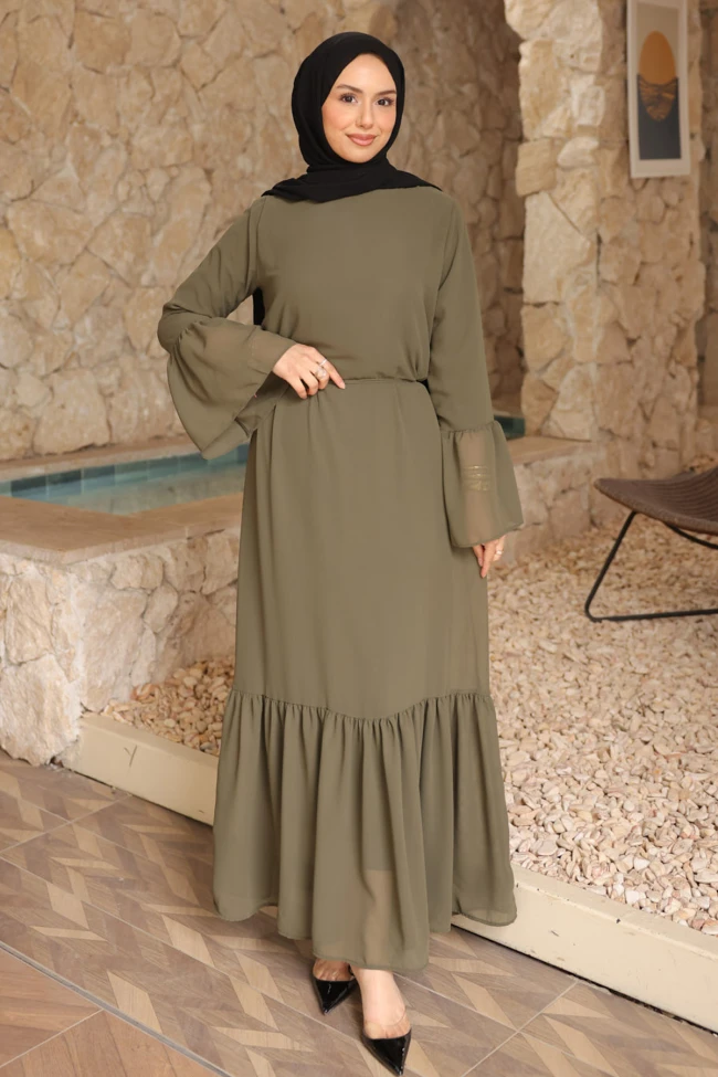 * Ürün Detay : Sade ama detaylarıyla fark yaratan, zarif ve çabasız şıklık sunan bir parça.Elbisenin en dikkat çekici yeri kollarındaki volan detaylar. Bilek kısmındaki transparan geçiş ve katmanlı yapı, elbiseye modern ve hareketli bir hava katmış.Etek ucundaki geniş fırfır detayı, düz kesim gövdeye feminen bir dokunuş ekleyerek tasarımın monotonluğunu kırmış.