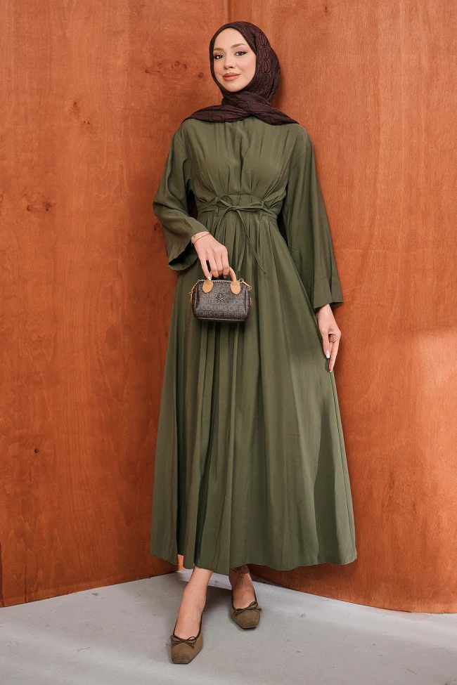 * Ürün Detay : Zengin renk tonu ve zarif detaylarıyla sezonun en iddialı parçalarından biri olan bu elbise, stilinde asalet arayan kadınlar için tasarlandı.Ayarlanabilir ince kuşak detayı ve beldeki estetik piliseler, bel hattınızı nazikçe belirginleştirirken dökümlü eteğiyle konforlu bir kullanım sağlar.Rahat kesim kollar, elbiseye modern bir hava katarken gün boyu hareket özgürlüğü sunar.