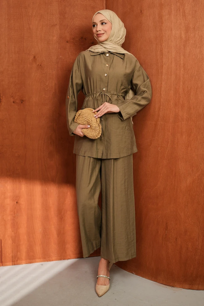 * Ürün Detay : Tunik-pantolon takımı, hem konforu hem de çabasız şıklığı bir araya getiren oldukça dengeli bir parça.Belden büzgülü ipli tasarımı, oversize görünümü kırmadan vücut hatlarını zarifçe belli ediyor. Gömlek yaka ve ön boydan düğme detayı, takıma hem günlük hem de şık bir hava katmış.Geniş paça kesimi, gün boyu hareket özgürlüğü sağlarken aynı zamanda modern bir silüet oluşturuyor.