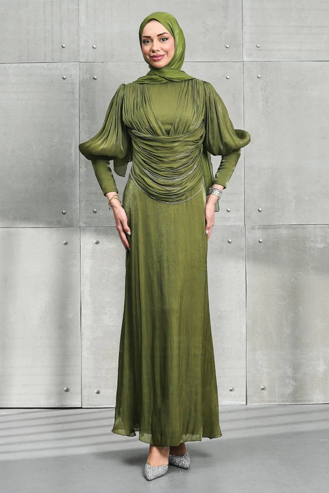 * Ürün Detay : Abiye, hem dramatik detayları hem de zarif siluetiyle oldukça iddialı bir model.Elbisenin üst kısmındaki çapraz drapeler ve bel bölgesindeki ince gümüş zincir detayları, tasarıma derinlik katmış. Bu detaylar hem hareket kazandırıyor hem de bel hattını zarifçe vurguluyor.Dirsek üzerine kadar bol gelen ve bilekte daralan manşetlerle birleşen balon kollar, elbiseye romantik ve modern bir hava katmış. Bu kol kesimi, omuz ve göğüs bölgesindeki drapelerle uyum sağlıyor.Belden aşağıya doğru hafifçe genişleyerek inen düz kesim, üst taraftaki yoğun detayları dengeleyerek boyu daha uzun gösteren bir illüzyon yaratıyor.Kol ve sırt fermuarlıdır.