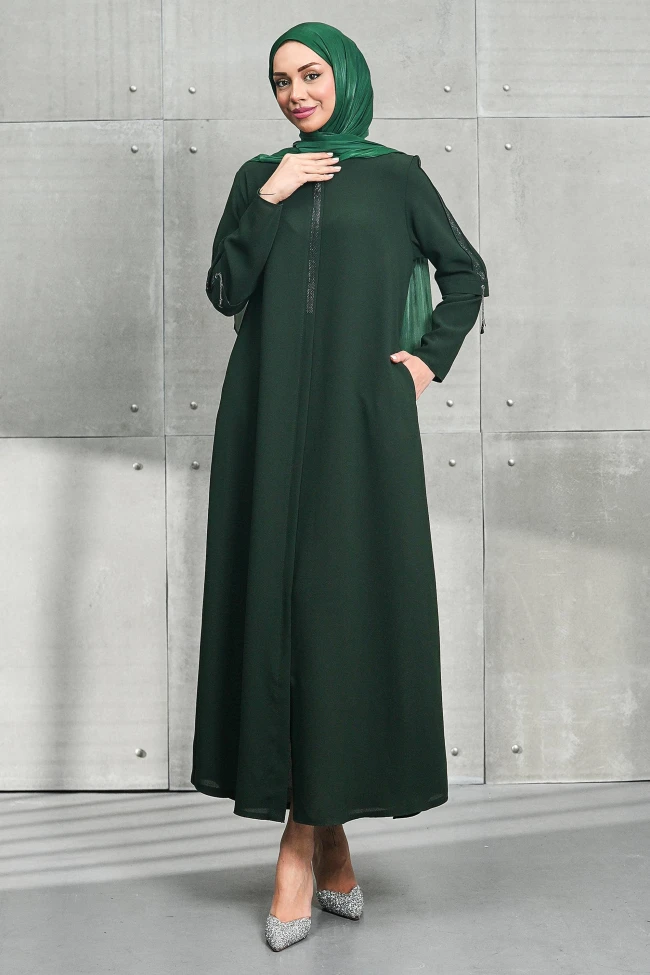 * Ürün Detay : Zarif, göz yormayan ama "buradayım" diyen bir model. Özellikle sadelikten yana olup detaylarda şıklık arayanlar için harika bir tercih.Feracenin aşağı doğru hafifçe genişleyen "A kesim" yapısı, vücut hatlarını belli etmeyen muhafazakar bir duruş sergiliyor. Bu kesim hem konfor sağlar hem de her vücut tipine hitap eder.Ön kısımdaki dikey taş veya payet şeridi, boyu daha uzun ve silüeti daha ince gösterme etkisine sahip.Omuzdan aşağı inen ve manşet kısımlarında küçük sarkıt detaylarıyla tamamlanan şeritler, elbiseye hareket katmış. Klasik ferace çizgisinden çıkıp modern bir hava yakalanmış.