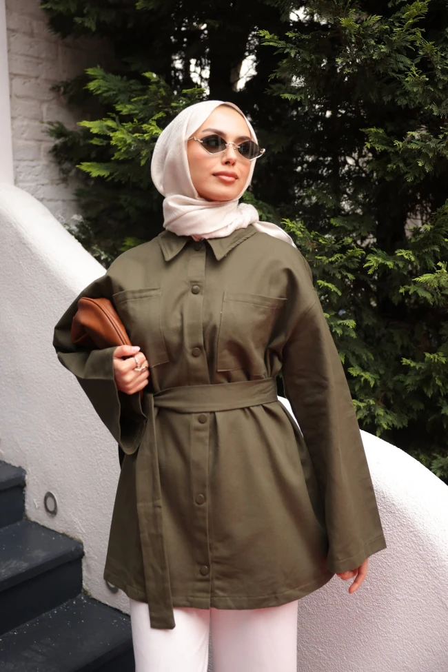* Ürün Detay : Kendi kumaşından olan kuşak, oversize kesime form kazandırarak bel hattını zarif bir şekilde belirginleştiriyor. Bu detay, ceketin tesettür giyimde aranan dökümlü duruşu bozmadan daha feminen bir siluet çizmesini sağlıyor.Geniş yaka tasarımı ve göğüs hizasındaki büyük kapaklı cepler, ürüne modern bir hava katarak onu günlük kullanım için oldukça dinamik hale getirmiş.Kumaşın tok ve kaliteli duruşu, ürünün formunu çok iyi koruyacağını ve rüzgarlı havalar için ideal bir dış giyim seçeneği olacağını gösteriyor.