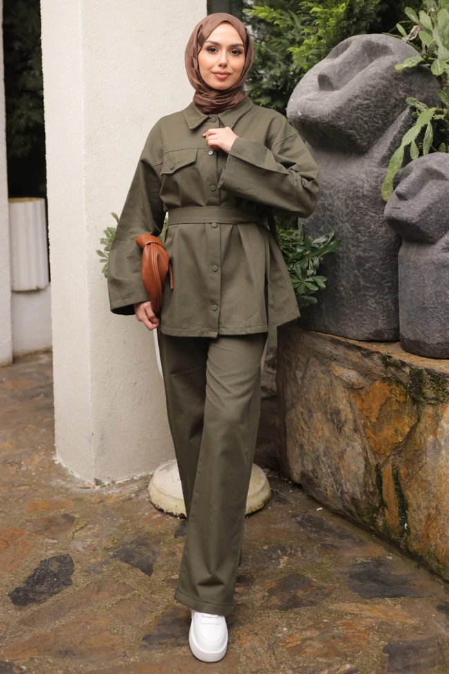 * Ürün Detay :Yeni sezon takımımız "safari" stilini modern muhafazakar çizgiyle birleştiren bir tasarıma sahip.Gömlek yaka kesimi ve kapaklı göğüs cepleriyle takım, klasik bir ceket pantolon havası taşıyor.Kendi kumaşından olan kemer, beli vurgulayarak oversize kesime daha feminen ve toplu bir görünüm kazandırmış. Bu detay, boyu daha uzun gösterme avantajı sağlar.Boru paça pantolon, üst parçanın hareketliliğini dengeleyen sade ve profesyonel bir duruş sergiliyor.Pantolonu yüksek bel ve ceplidir.